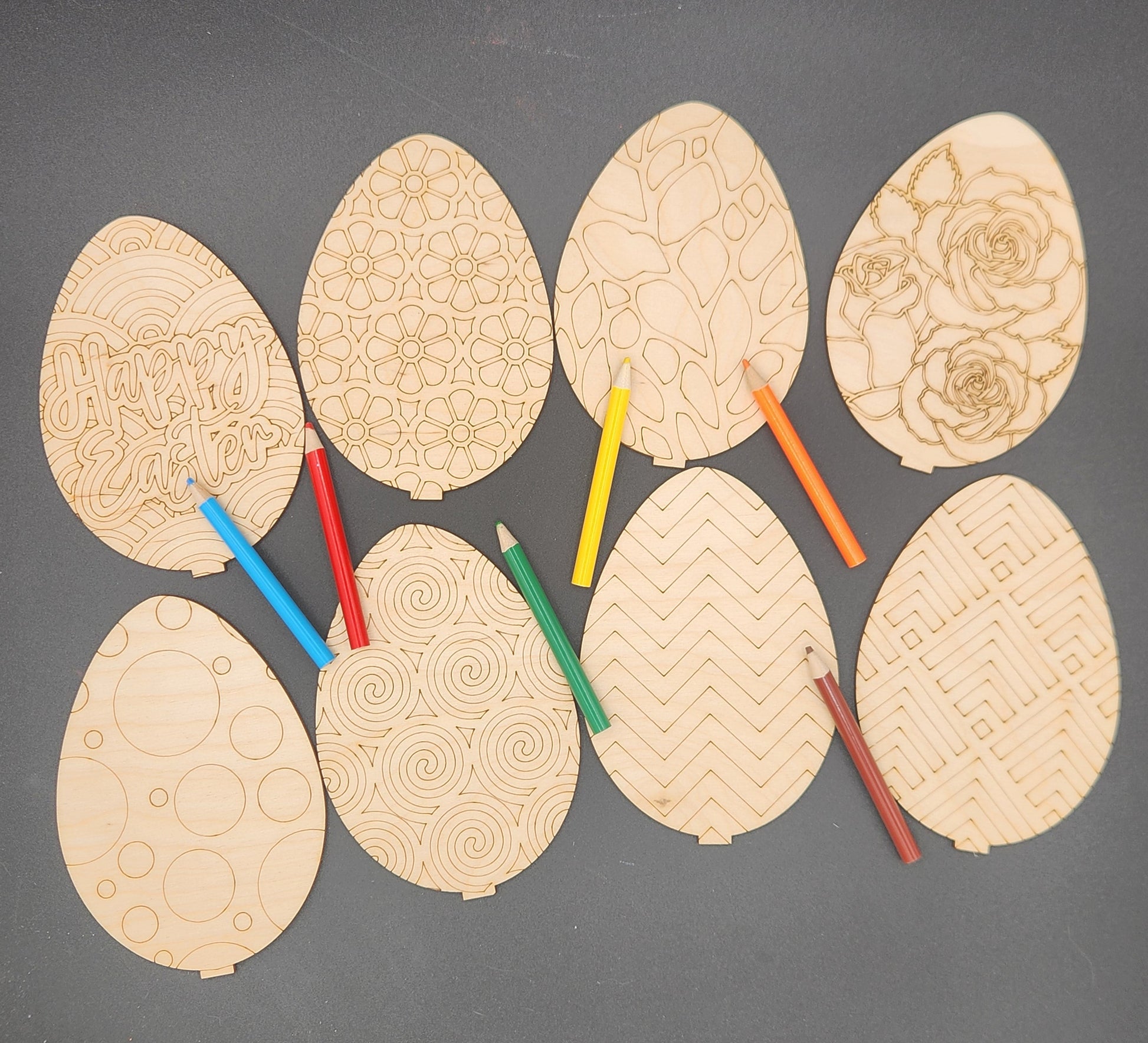 Each kit includes 2 Easter Eggs with stands (will be picked at random) or get a mega kit with all 8 options. All kits include 6 small colored pencils (one set per order kit ordered). Each egg is approx. 5.25"H