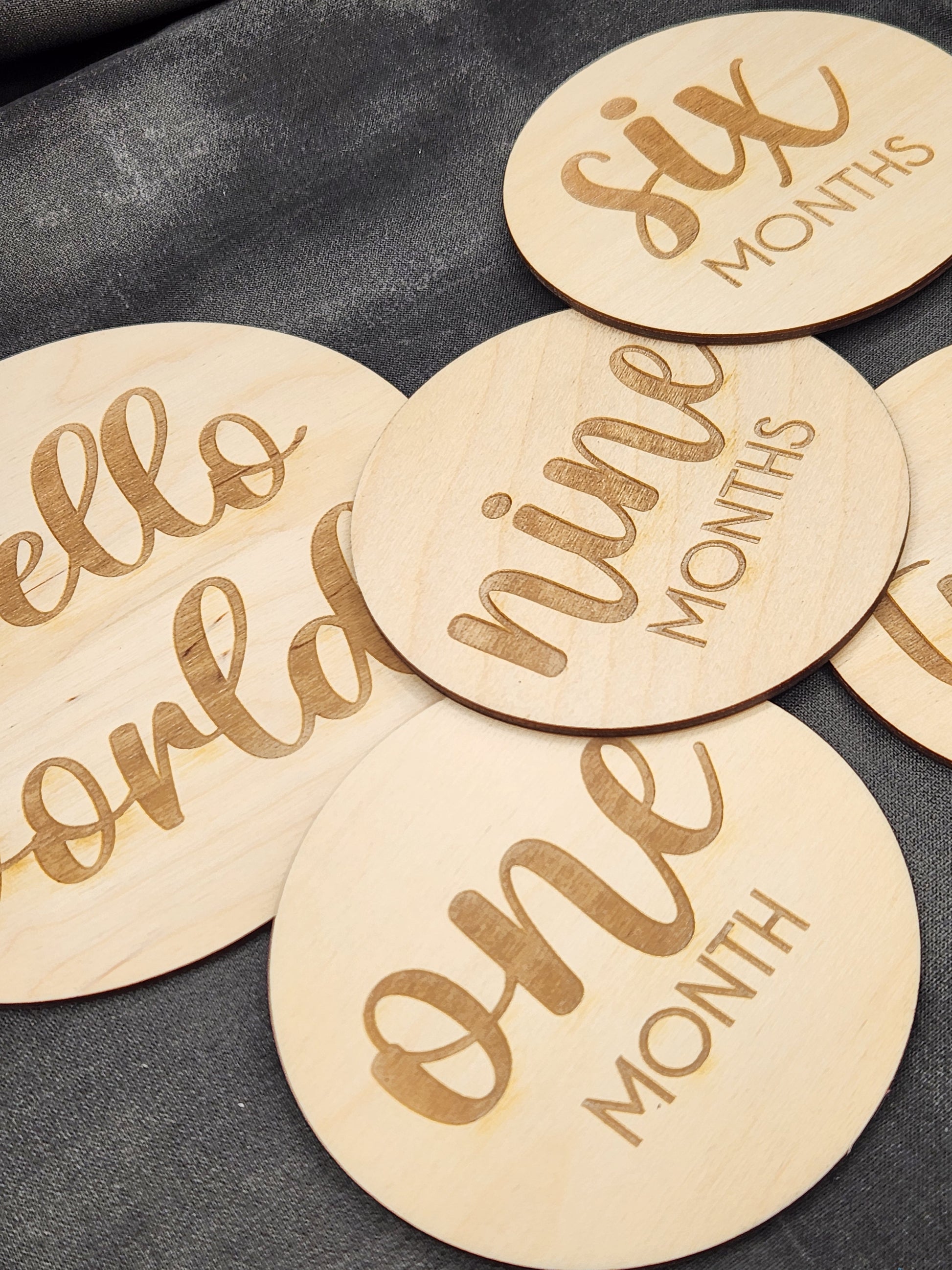 Includes milestones 1 month - 12 months. Optional add - Hello World (6" round).